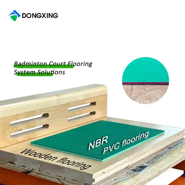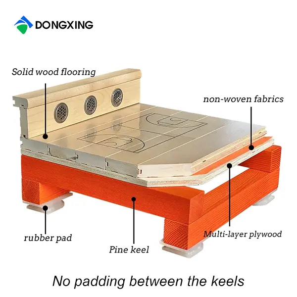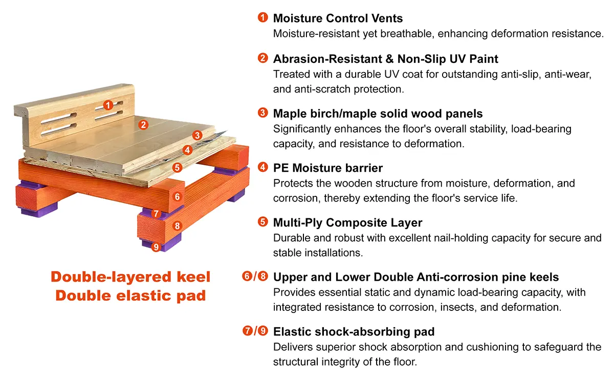 Double-Layer Joist: Pine solid wood joists with high-density rubber/EPDM cushioning pads laid continuously on two layers, achieving 360° all-around shock absorption.